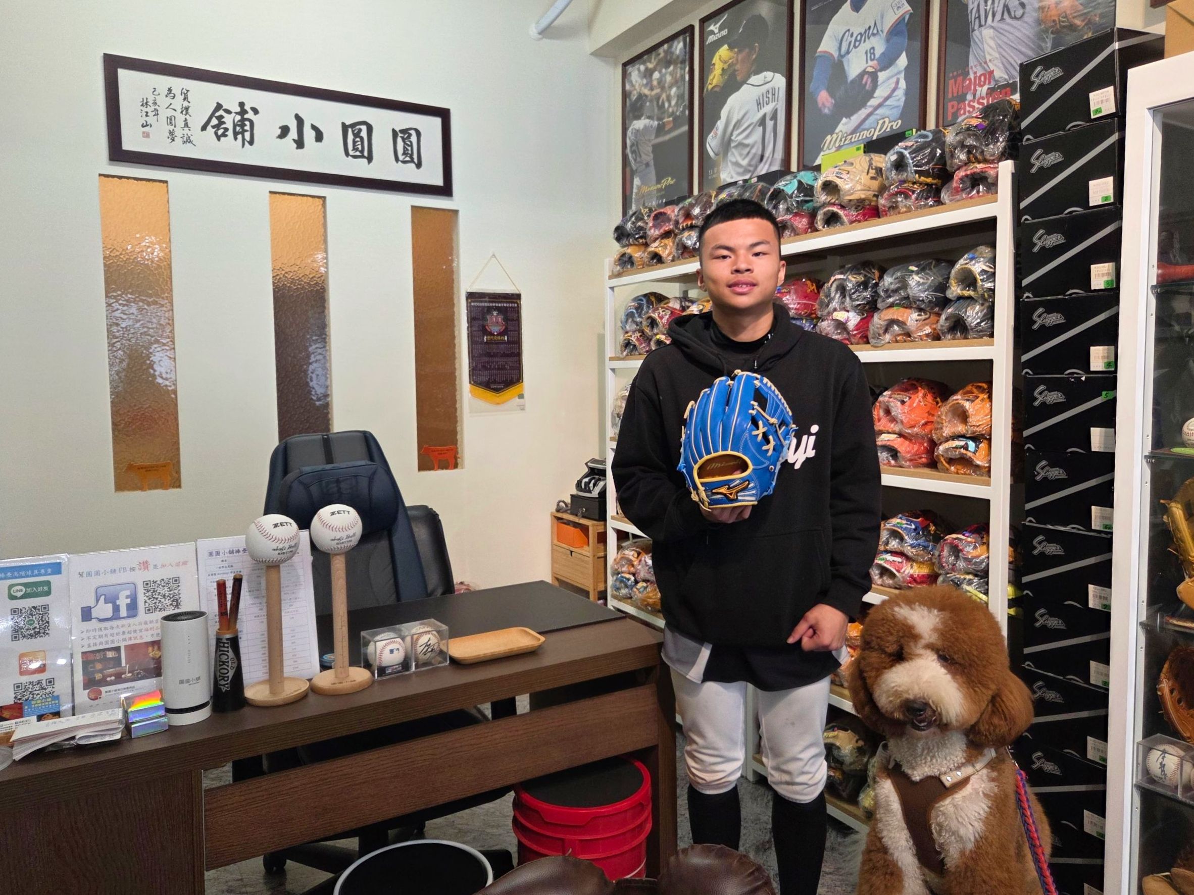 後來回國後一直想再買一咖內野的神宮外苑限定版手套, 因為他耳聞圓圓這邊手套種類非常多,一直嚮往能找一天來現場尋找試戴, 所以就在媽媽的陪同下,帶了他心愛的寵物一起來尋寶,並順利完成他的心願,最終帶著這支剛滿一歲的大型貴賓狗在小舖留影紀念,俗話常說狗來富,我們希望把這份富(福)氣與球友們分享,更祝福王同學在球場上有好的表現,也希望有朝一日能成為明日之^^~