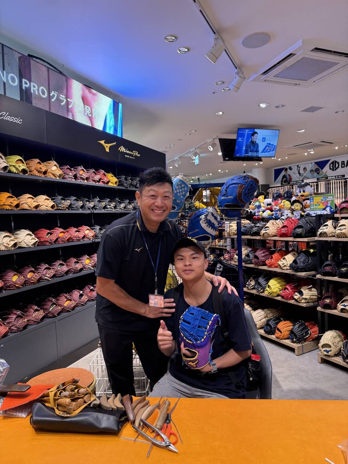 這位有著青澀帥氣面孔的王同學本來在國中時期只是參加社區棒球隊, 之後越打越有興趣,為了精進球技,甚至報名參加了彭政閔主持的棒球學校 (恰棒球學苑) 去苦練功夫。家長非常支持就讀高一的他從事棒球運動,索性直接送進有棒球隊的高中去就讀,更難得的是日前帶他去日本逛逛手套名店,甚至直接買咖mizuno pro order一壘手手套並請伊藤大師親自幫手套稍微整型並與他合影