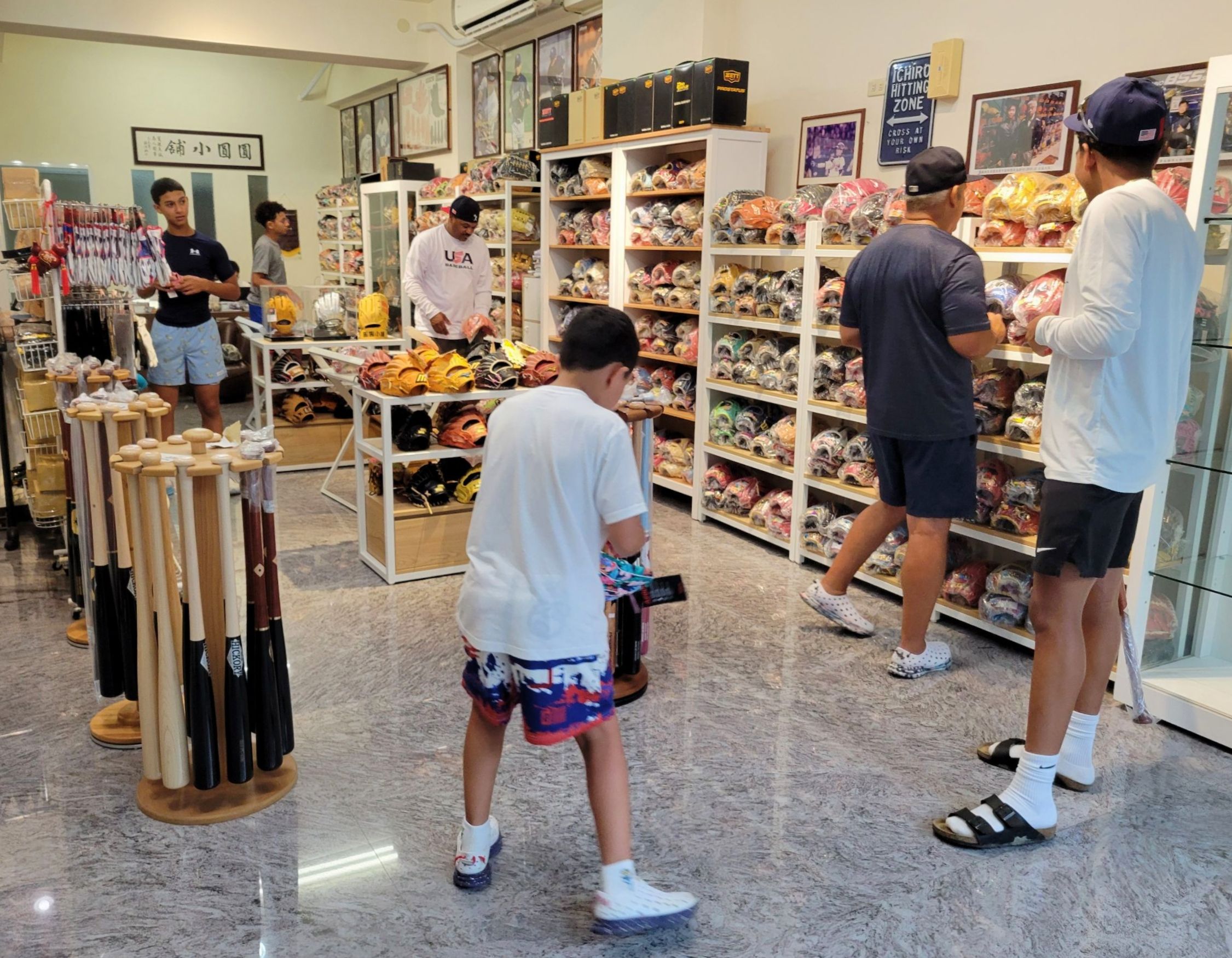 美國年輕人一樣喜歡顏色比較亮眼的樣式,經過介紹和試戴,一行人帶走Rawlings 大R西岡剛款式、Wilson A2000 DP15和ZETT PROSTATUS水藍色今宮健太款